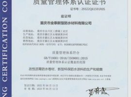 重庆市金泰新型防水材料有限公司,成立于2001年,注册资金5023万,公司注册地位于重庆市永川区三教镇工业区,办公总部位于重庆市九龙坡区科城路智博中心,分公司位于重庆市綦江区永城镇,是专业从事新型建筑防水材料的开发、设计及生产,集生产与施工为一体、销售与指导相结合、施工与保修相关联的综合性企业。防水防腐保温工程专业承包一级资质。 公司注册商标“金泰牌”,传承了近20年的防水产品生产历史,代表着重庆本土防水材料生产企业的骄傲,多次被评为重庆知名商标,并荣获工商管理部门颁发的守合同重信用单位、消费者信得过企业等多种荣誉证书。   公司技术力量雄厚,拥有现代化的生产设备、完善的质保体系和先进的检测手段。自成立以来,以过硬的产品质量,一流的售前售后服务,博得了广大用户青睐,树立了良好的企业形象和信誉。取得了“全国工业产品生产许可证”、“安全生产许可证”,通过了“ISO9001:2015质量管理体系认证”,“ISO14001:2015环境管理体系认证”,是中国建筑防水材料工业协会会员单位,中国质量检验协会会员单位,重庆市建筑防水行业协会常务副会长单位。   公司坚持以质量求生存,以信誉求发展,以优质服务回报大众的企业理念,不断提高技术创新能力,采用新技术推出有竞争力的产品。2015年公司在綦江分公司建成一条全自动防水卷材生产线,年生产能力可达到3000余万平方米,除生产常规的SBS、APP、湿铺、预铺、自粘等防水卷材外,还可生产出反应粘结型高分子自粘卷材、耐根穿刺防水卷材,能满足广大客户不同的购货需求,更好的服务于工程建设。公司还拥有一条完备先进的涂料生产线,涂料生产工艺成熟,可自主生产出环保型彩色聚氨酯防水涂料、聚合物水泥基(JS)防水涂料、非固化橡胶沥青防水涂料、水泥基渗透结晶型防水涂料、丙烯酸酯防水涂料等多种防水涂料。2020年增设高分子(TPO、PVC、HDPE等)生产线。    公司拥有各种专业技术人员58人,施工设备先进,技术力量雄厚,具有承揽各种高难度防水工程的实力,做到了“施工现场管理规范化、防水材料标准化、施工队伍专业化、防水工程保修服务一体化”,承接的多处工程被评为市级优良工程,并依靠众多成功鲜活的工程案例,成为了众多房地产开发商、建筑商的长期合作伙伴。 公司不断完善售前、售中、售后服务,坚持“精心制造、精心施工、精心服务”,经过近几年的改革整合,确立了做大做强“金泰牌”防水产品的发展战略,打造了一支营销服务的精英团队,将客户满意作为永久不变的追求,不断提高服务意识和服务水平,完善西南地区乃至全国的服务体系,不断提升品牌形象。公司还会始终与市场保持同步,推进技术创新,增强核心竞争力,不断开发新品种,力争成为重庆防水行业的领航者,引领防水行业发展的新潮流。