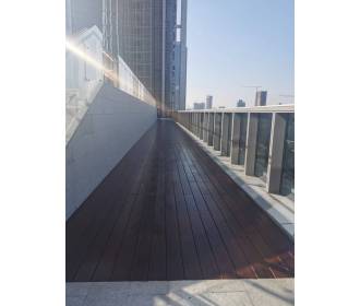 案例描述::广州之窗商务港户外泳池休闲区木地板项目安装和供货量为380平方,涉及到弧形的安装,难度较大。